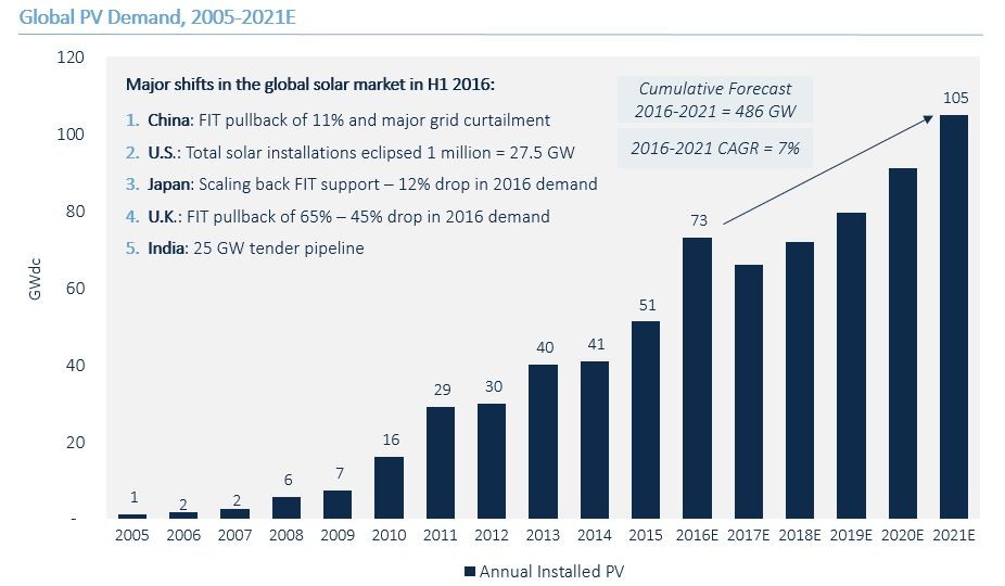 OFweek太阳能光伏网讯:根据GTM最新发布的太阳能需求监测报告来看,2016年,全球新增太阳能装机容量将比去年增长43%,达到73吉瓦。