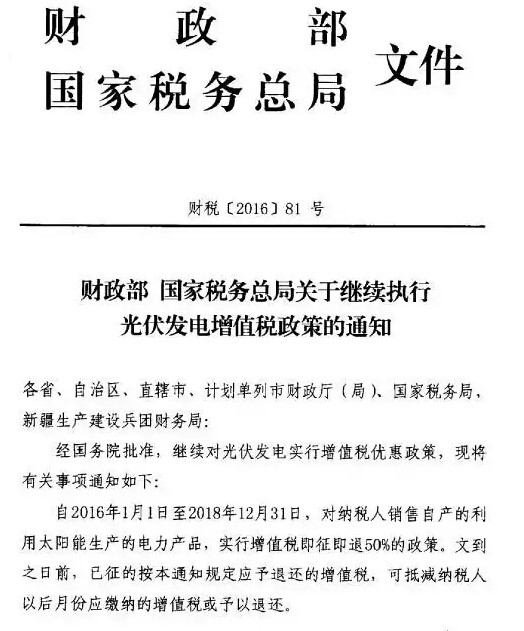 昨日深圳市某地税局官方微信爆料称,国家财政部、国家税务总局下达了《关于继续执行光伏发电增值税政策的通知》,通知中称“经国务院批准,继续对光伏发电实行增值税优惠政策”、“自2016年1月1日至2018年12月31日,对纳税人销售自产的利用太阳能生产的电力产品,实行增值税即征即退50%的政策。文到之日前,已征的按本通知规定应予退还的增值税,可抵减纳税人以后月份应缴纳的增值税或予以退还?!?