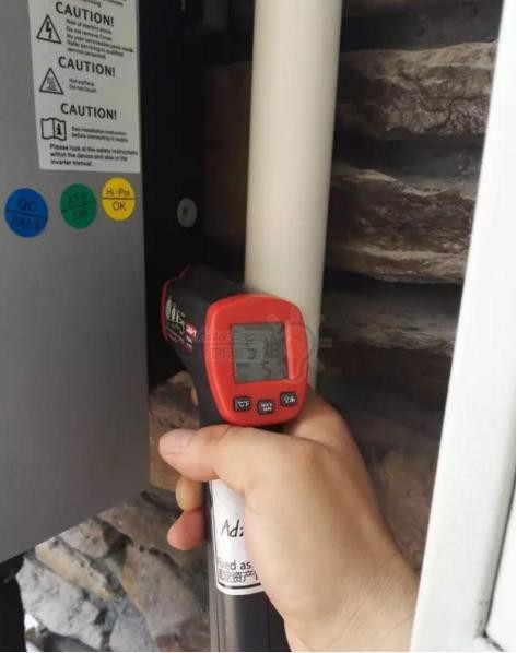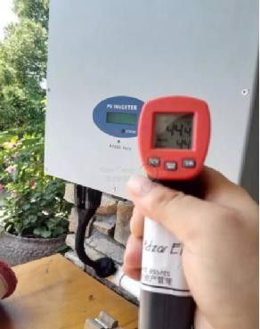 逆变器安装在北面屋檐下,由于没有太阳直射,输出功率为80%,逆变器表面温度为44.4度,比气温高5度左右,整体散热性能良好。