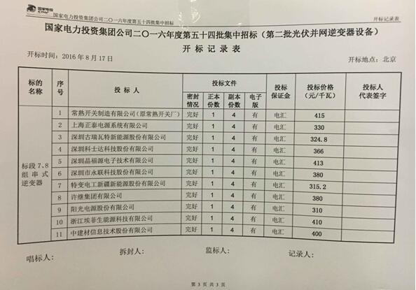 国电投2016年度组串式逆变器投标价格