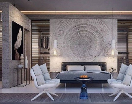 下面就一起来看看主人套房。一个独立的混凝土墙遮挡它后面的更衣室,这是一个非常惊人的聪明设计。