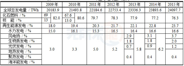 表1   REN21:2009~2015年全球电力生产结构