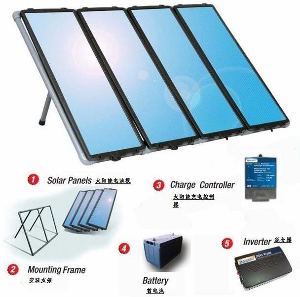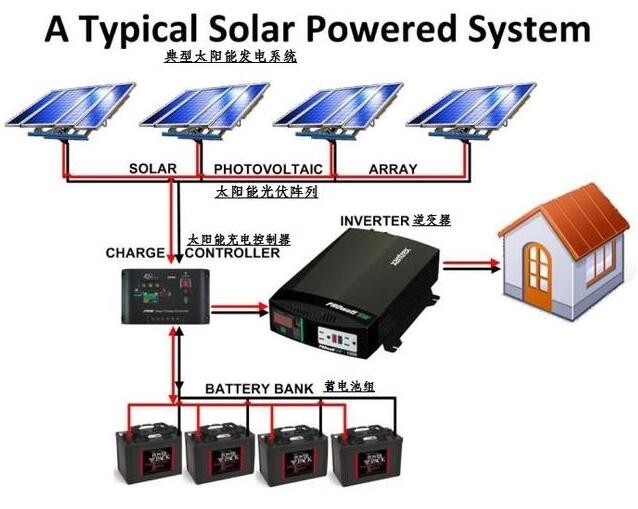 太阳能电池板依次排列形成太阳能光伏阵列,加大了太阳能的吸收面积也就增多了转化的电能;太阳能通过太阳能充电控制器将转化后的电能储存在蓄电池组中,当家庭中需要用电的时候,蓄电池组进行放电,通过逆变器将直流电变为家庭用交流电,供家庭日常生活使用。