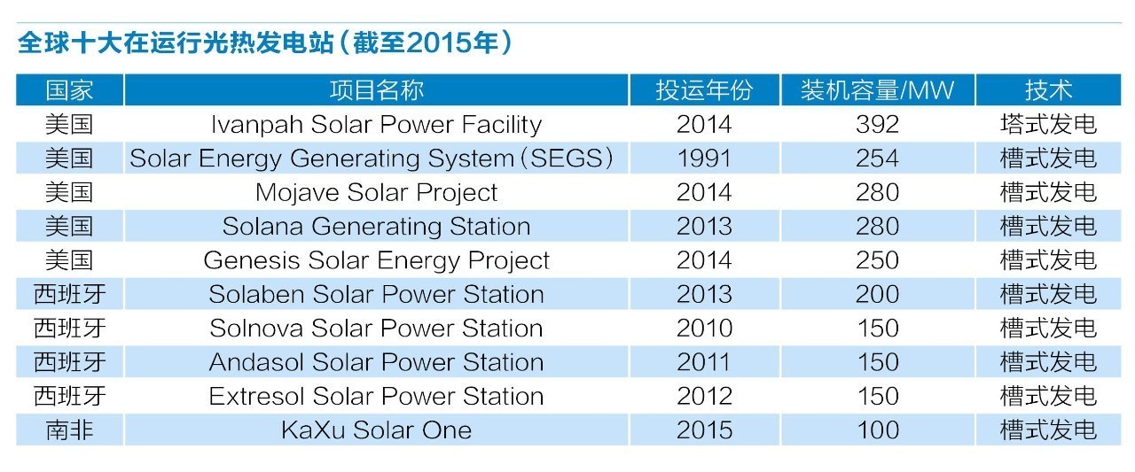 正因如此,光热日益成为欧美各国青睐的未来能源产业。眼下,美国和西班牙是这个产业的领头羊。截至2015年,这两国占据着全球最大十家光热电站的前九家,另外还有一家在南非。而随着今年2月美国内华达州装机110MW的新月沙丘塔式熔盐光热电站正式并网发电,这两国便垄断了全球十大光热电站。