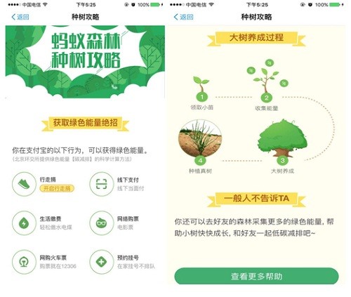 “碳账户”通过设计成带有趣味性的“蚂蚁森林”游戏,即用户的步行、地铁出行、在线缴纳水电煤气费、网上缴纳交通罚单、网络挂号、网络购票等等行为,都会减少相应量的碳排放,从而可以在支付宝内种养一棵虚拟的树。