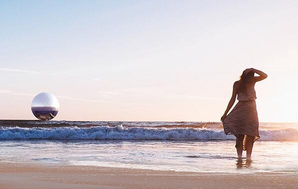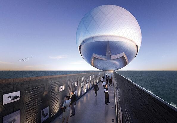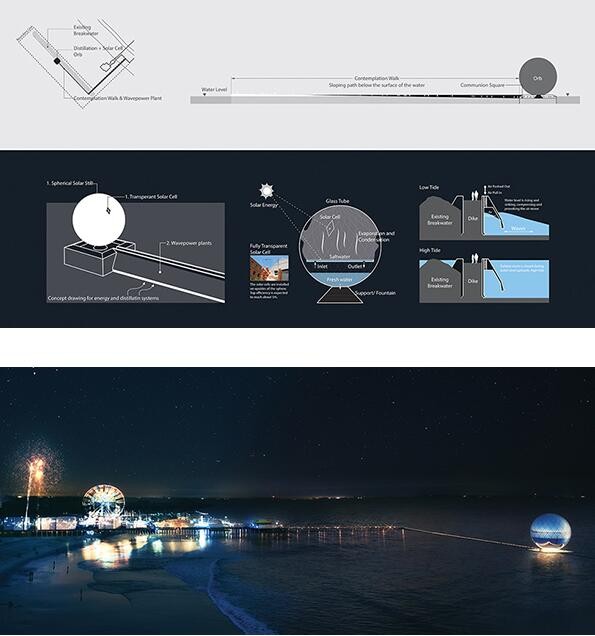 来自韩国的一个设计师团队为2016 land art generator initiative(陆地艺术发电计划)设计了clear orb装置,该装置位于加利福尼亚圣莫妮卡地区,是一个直径40米的玻璃圆球,它能将海水淡化成淡水,为城市电网提供电力,是一个符合可持续发展理念的基础设施。