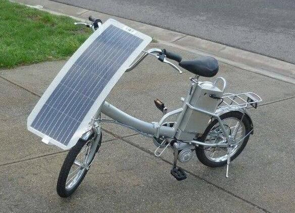 这款太阳能自行车车头有一块很大的太阳能板来吸取太阳能,通过太阳能来转化为电力,输入到座位下的电池里,可以说这辆自行车的已经适应了任何的天气了。