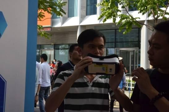 参观者体验暴风魔镜。记者也试戴了一下,呈像效果一般。