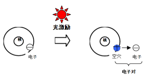 具体来说。首先,我们知道,物质都是由原子组成的,原子由原子核和围绕原子核旋转的电子组成。半导体材料处于稳定状态时,原子核和核外电子紧密结合。当有外界激励,例如光照射到器件上时,能量大于硅禁带宽度的光子进入硅中后,会在P区、N区以及耗尽层(空间结构上等同于空间电荷区)中激发出光生电子-空穴对。通俗来讲,就是原子核和电子的结合力因光的刺激而降低,电子摆脱了原子核的束缚,成为自由电子。如下图: