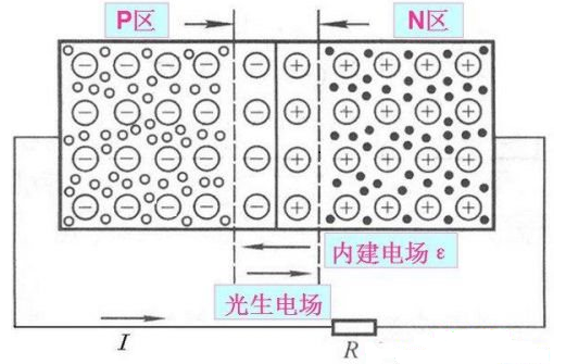 光生电场使得P区带正电,N区带负电,从而N区和P区之间就会产生电动势,这就是光生伏打效应。当电池接上负载R后,光电流就可以从P区经负载流至N区。负载据此效应就可以得到一定的功率输出。