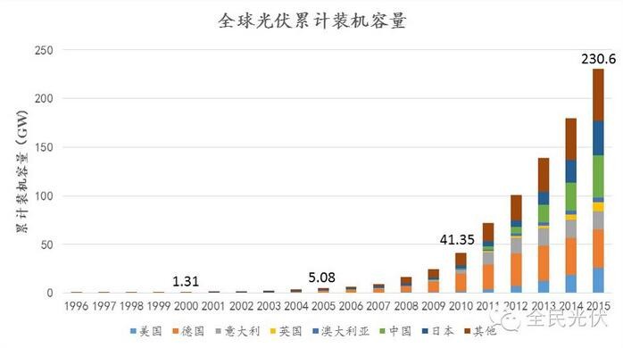 得益于光伏系统价格的下降以及世界各国强劲的光伏补贴政策,全球光伏市场在过去的10年高速增长,从2005年5GW到2015年的230GW,其中2005-2010年主要的市场是以德国为首的欧洲国家,而从2011年-2015年,中国、美国、日本的光伏市场高速发展。根据ITRPV、IRENA等机构的预测,全球光伏累计装机容量将在2025年达到1750-2250GW。这是一个高达2.2万亿美元的巨大市场。