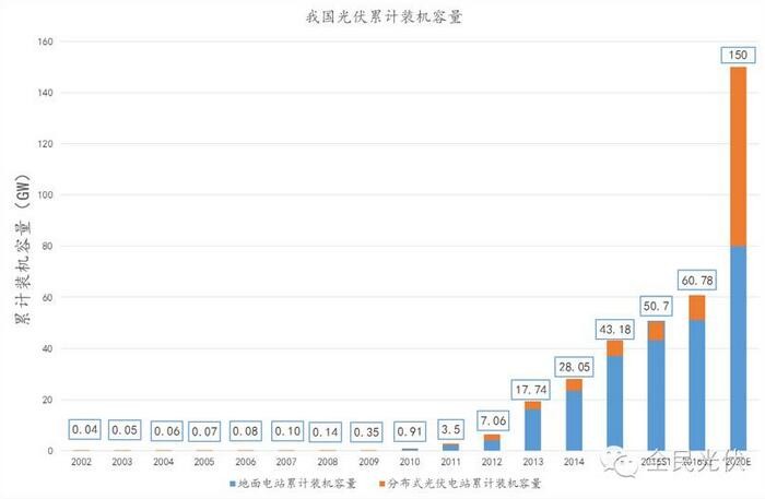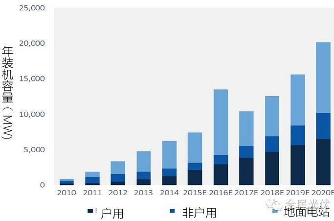 截至2015年底,我国光伏发电累计装机容量4318万千瓦,成为全球光伏发电累计装机容量最大的国家。其中,地面光伏电站3712万千瓦,分布式光伏606万千瓦(占比14.03%),年发电量392亿千瓦时,2015年新增装机容量1513万千瓦,占全球新增装机的四分之一以上。2016年上半年新增装机容量1760万千瓦,发电量为293亿千瓦时,同比增长28.10%。根据国家能源局在2015年12月发布的《太阳能利用十三五规划(征求意见稿)》,我国光伏发电规划装机容量在2020达到15,000万千瓦(其中分布式为7,000万千瓦,占比46.67%),年均复合增长率为30.3%。