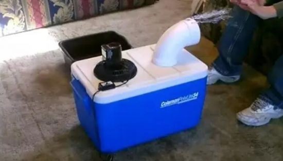 整个制作过程只需15分钟。首先,desertsun02使用电锯在塑料箱顶部开了两个孔,其尺寸需要与PVC管和小风扇保持一致。随后,他在塑料箱中放入冰块,并将风扇朝向塑料箱内部。该风扇不仅可以使用太阳能供电,还连接到一个电池组。desertsun02表示,电池组能使用7小时时间,而冰块融化时间约为5小时。