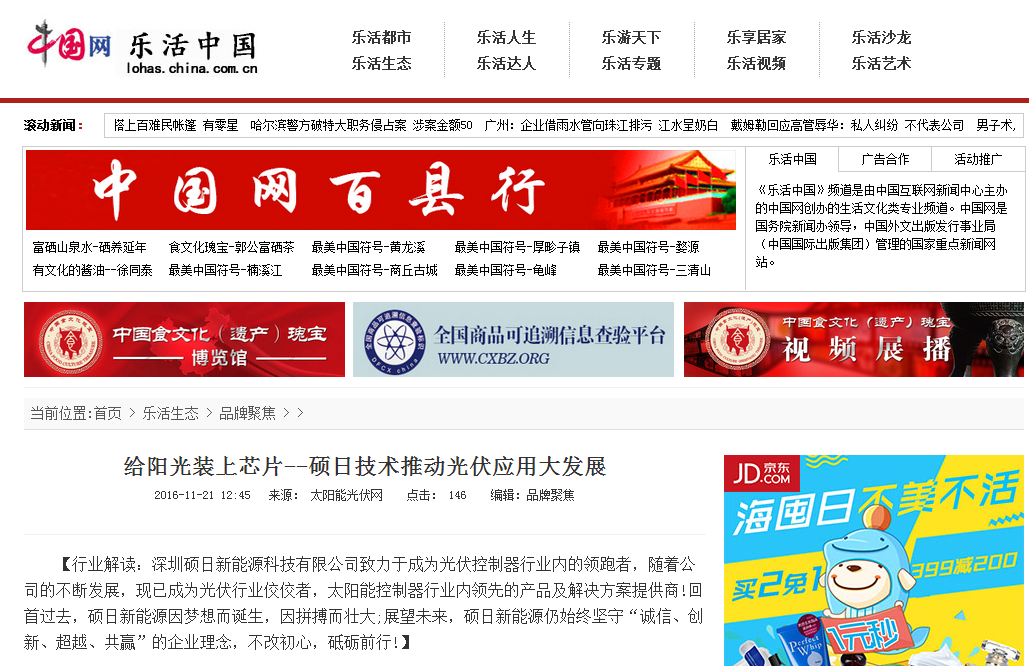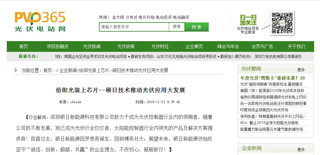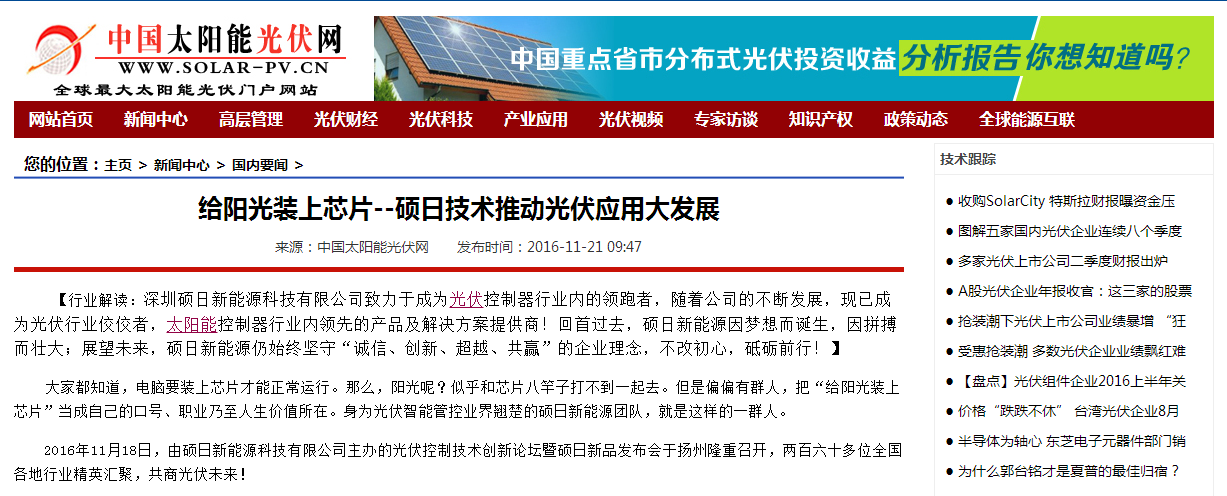 2016年11月18日,万众瞩目,光伏控制技术创新论坛暨硕日新品发布会在扬州成功召开后,引起了各大媒体和行业的震撼关注!作为光伏储能管控专家的硕日,是全国以光伏控制器技术创新为核心的企业,8年来只专注做一件事,把太阳能控制器做到极致,“给阳光装上芯片”,硕日技术推动了光伏应用大发展,引无数媒体争相报道,在行业内和网上掀起关于“硕日”的信息狂潮。