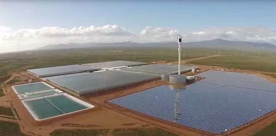 这个投资近2亿美元的温室,由23000太阳能板、一个150米高的塔、附属的海水淡化系统所组成。从2公里以外的海湾中抽取海水,太阳能电板反射的太阳光照射到塔的顶端,热量将海水转变为热量、纯水和电力。经淡化后的水就可以用于温室中的西红柿种植啦。
