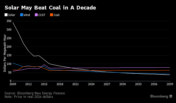 太阳能发电成本可能在十年内低于煤炭。来源:Bloomberg