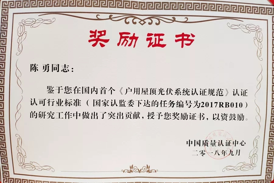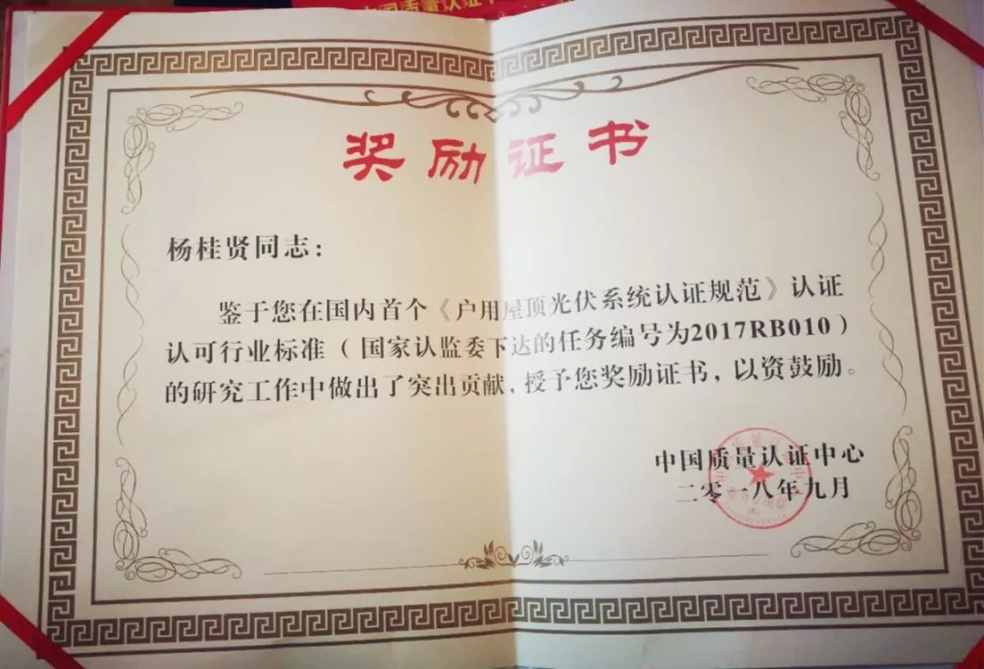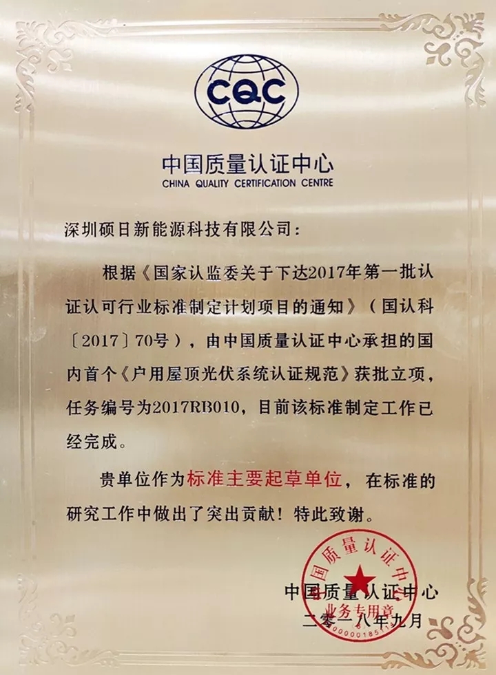 此次认证规范是根据国家认监委关于下达2017年第一批认证认可行业标准制定计划项目的通知,由中国质量认证中心承担的国内首个《户用屋顶光伏系统认证规范》获批立项。硕日新能源荣幸作为标准的主要起草单位,得到嘉奖赞扬并被授予奖牌和荣誉证书。