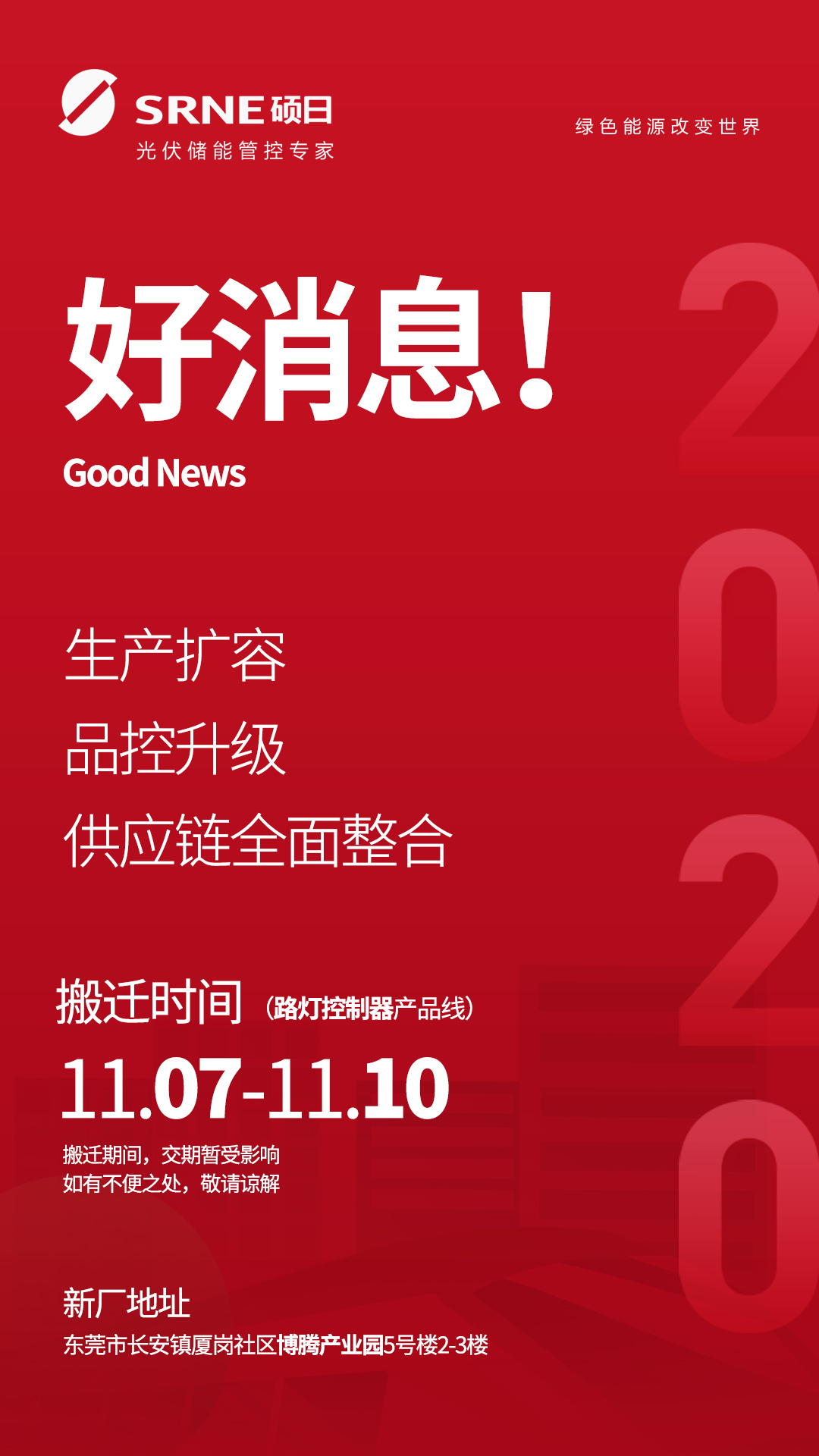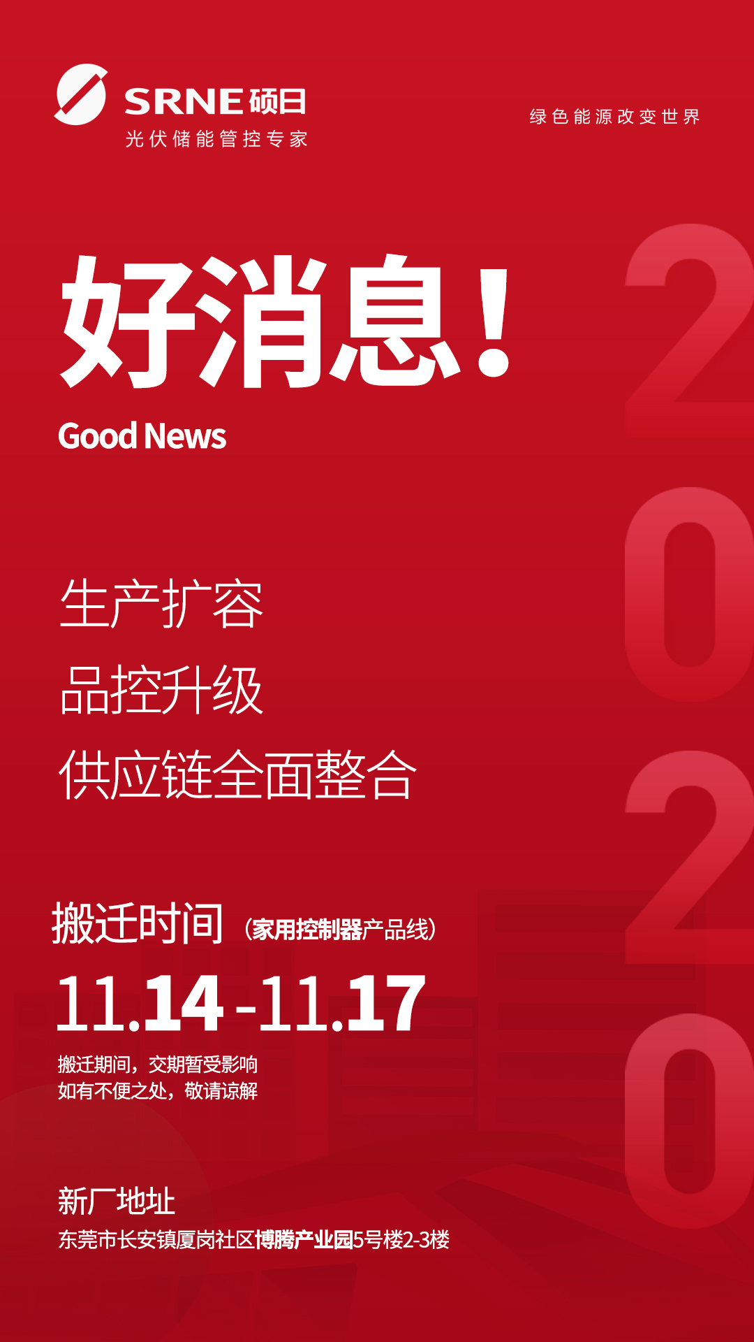 承蒙各位长期以来对本公司的大力支持与配合,本公司全体员工表示由衷的感谢!因业务发展需要和生产规模的扩大,自2020年11月7日起,我司工厂将搬迁至东莞市长安镇厦岗社区博腾产业园5号楼2-3楼,搬迁期间,交期暂受影响,给您带来的不便,我们深表歉意,并敬请谅解!硕日将以此次搬迁为一个新的起点,进一步为您提供更优质的产品和服务,与您共同发展,并再次感谢您长期以来给予本公司的支持与合作!