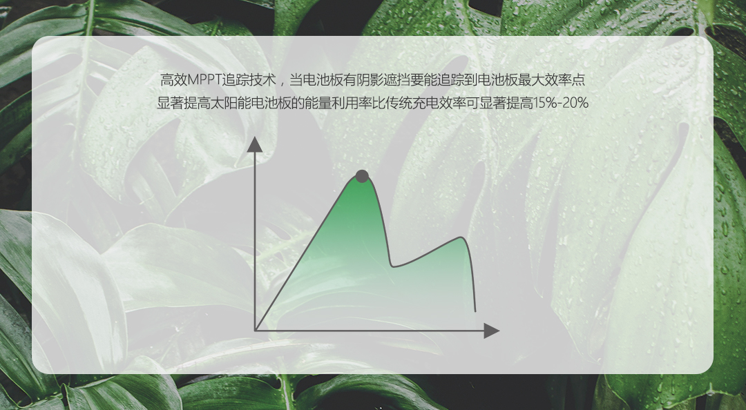1、高效MPPT追踪技术,当电池板有阴影遮挡要能追踪到电池板最大效率点,显著提高太阳能电池板的能量利用率,比传统充电效率可显著提高15%-20%。